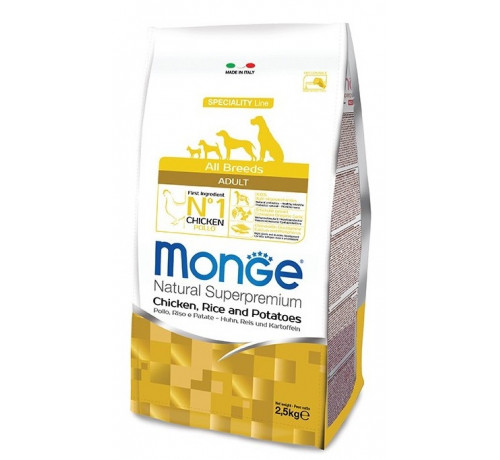 Monge Natural Superpremium Speciality Line All Breeds Adult sono deliziose crocchette con Pollo, Riso e Patate sono un alimento completo e bilanciato per cani adulti di tutte le razze che necessitano di alimenti ad alta digeribilità.
