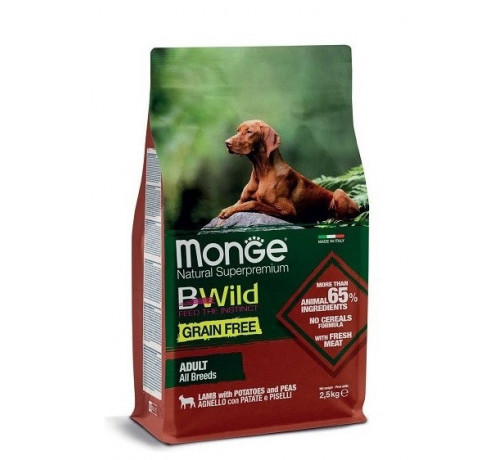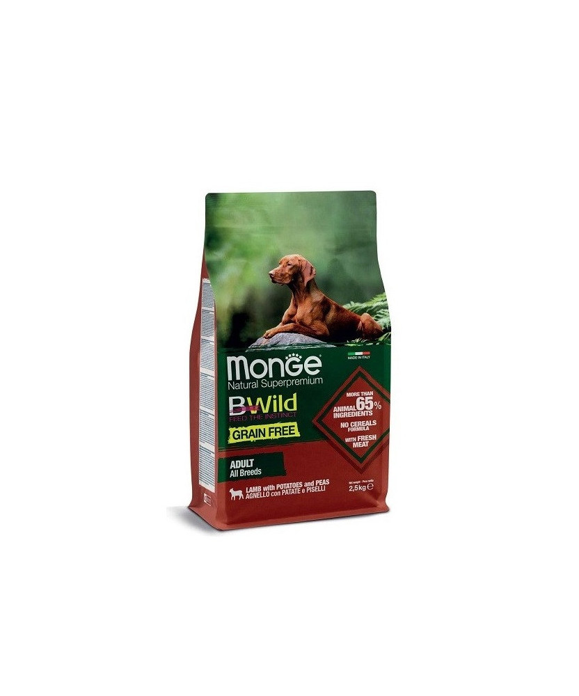 Monge Natural Superpremium BWild Grain Free per Cane Adult All Breeds con Agnello, Patate e Piselli da 2,5 Kg