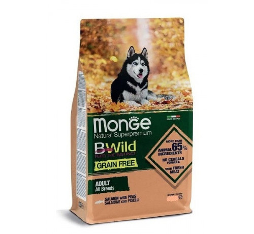 Monge Natural Superpremium BWild Grain Free per Cani Adulti All Breeds con Salmone e Piselli da 12 Kg
