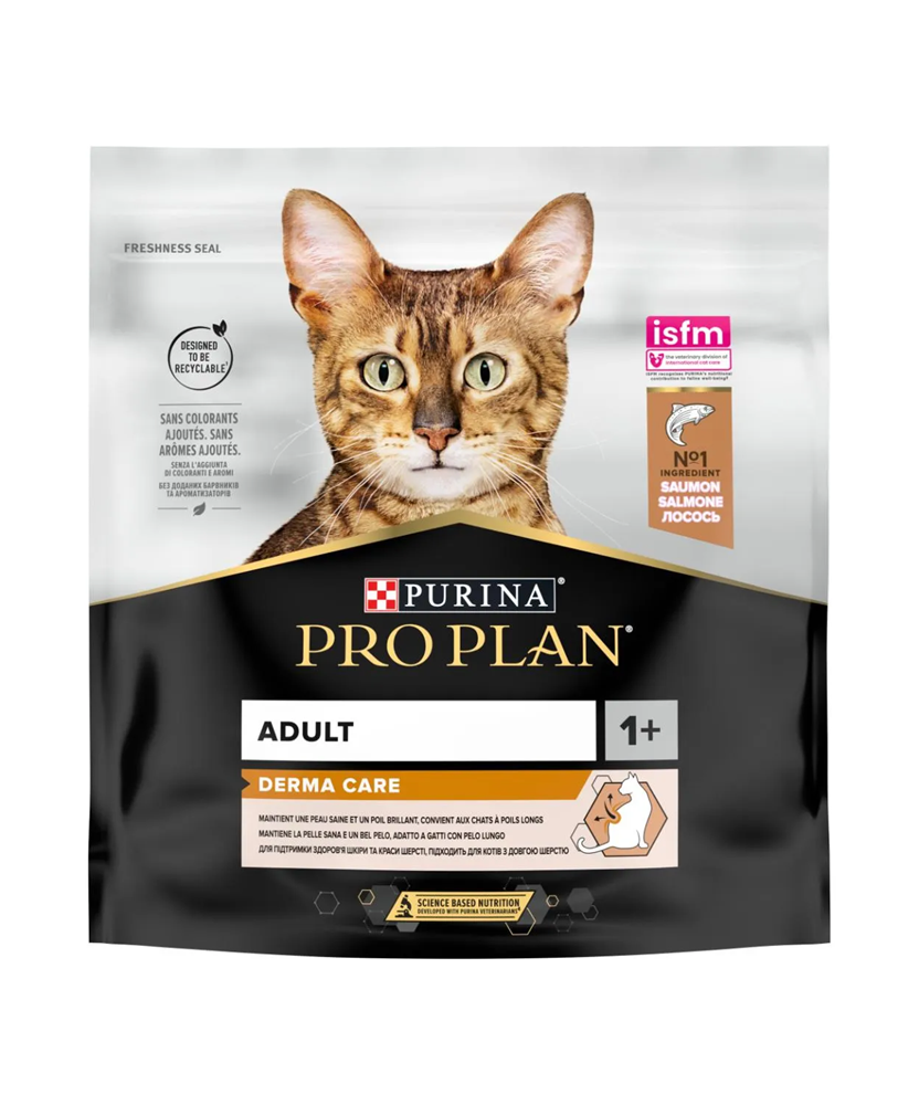 PURINA PRO PLAN ADULT 1+ DERMA CARE RICCO IN SALMONE è un alimento completo per gatti adulti, formulato per aiutare a mantenere la pelle sana e un bel pelo, adatto a gatti con pelo lungo.
