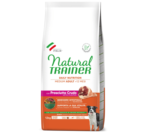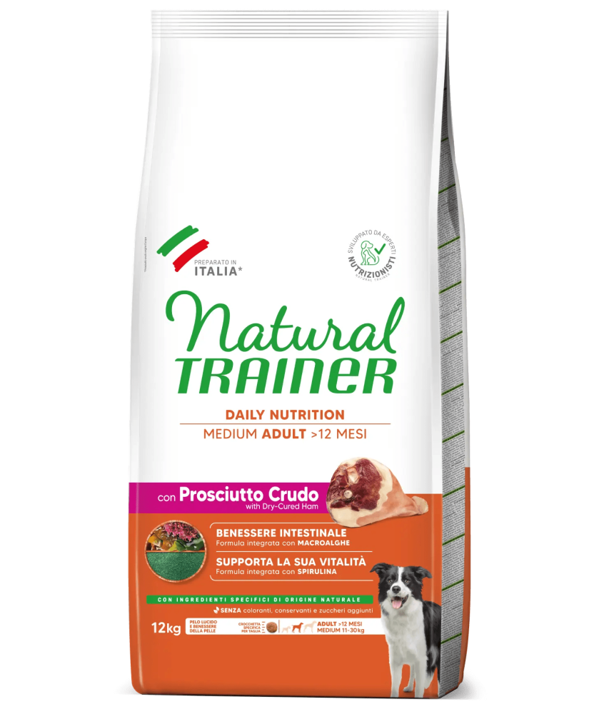 Trainer Natural Adult Medium con Prosciutto Crudo, Riso, Cicoria e Alga Spirulina è un alimento secco completo per cani adulti a partire da un anno di età e di taglia media (fino a 30 kg di peso). L ...