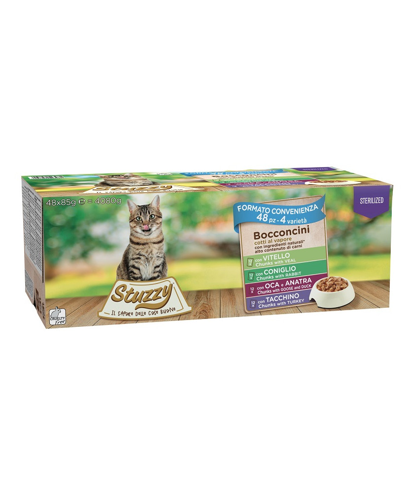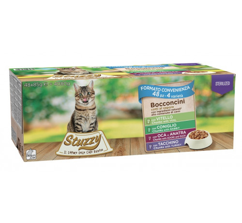 Fai scorta di gusto per il tuo gatto sterilizzato. Scopri il multipack Sterilized di Stuzzy con Bocconcini con Vitello, Bocconcini con Coniglio, Bocconcini con Tacchino e Bocconcini con Oca e Anatra.