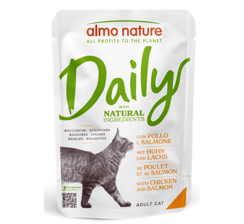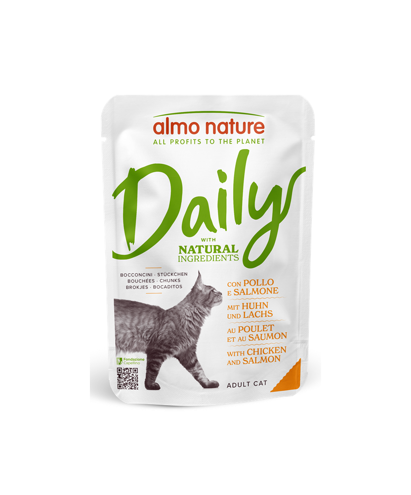 Almo Nature propone da sempre una filosofia nutrizionale alternativa, semplice e rigorosa che pone al centro di tutta la sua produzione la qualità degli ingredienti. Daily, in pratiche bustine monoporzione salvafreschezza, è un cibo umido completo che saprà rendere felice il tuo micio.