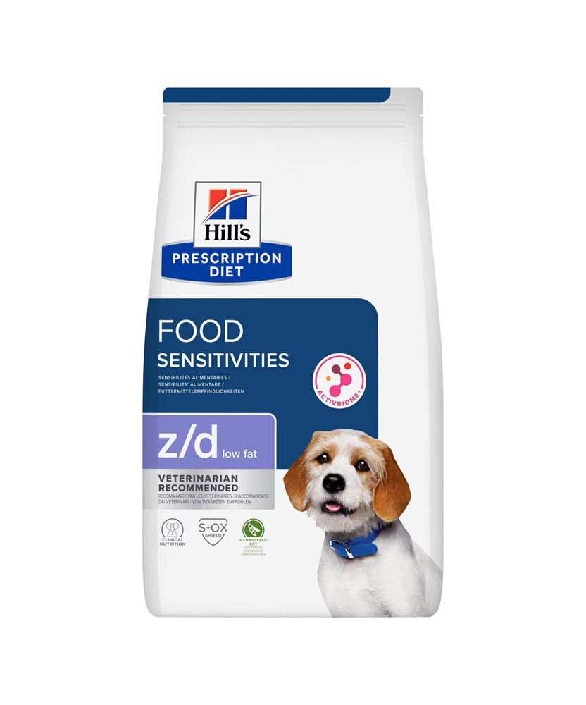 Hill's PRESCRIPTION DIET z/d Low Fat alimento per cani alla soia idrolizzata è un alimento dietetico completo per la riduzione delle intolleranze a ingredienti e nutrienti nei cani adulti. Questo alimento contiene una fonte selezionata di carboidrati ed una fonte proteica idrolizzata. Le sensibilità e le intolleranze alimentari sono problemi potenzialmente gravi che possono provocare irritazioni della pelle, del pelo e delle orecchie o persino disturbi gastrointestinali. I cani che hanno reazioni avverse al cibo dovute a un'allergia alimentare (tipicamente a una proteina nel cibo) o un'intolleranza traggono beneficio da un alimento progettato per le sensibilità alimentari. I nutrizionisti e i veterinari di Hill's hanno sviluppato la nutrizione clinica Prescription Diet z/d appositamente formulata per ridurre i segni cutanei e gastrointestinali causati dalle intolleranze alimentari. Difatti z/d è un alimento clinicamente testato per aiutare a evitare reazioni avverse al cibo.