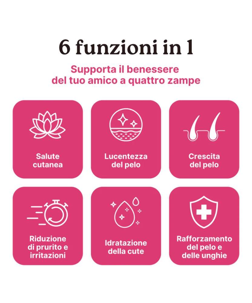 - Rinforza il pelo del cane e del gatto, favorendo un pelo più folto e lucente