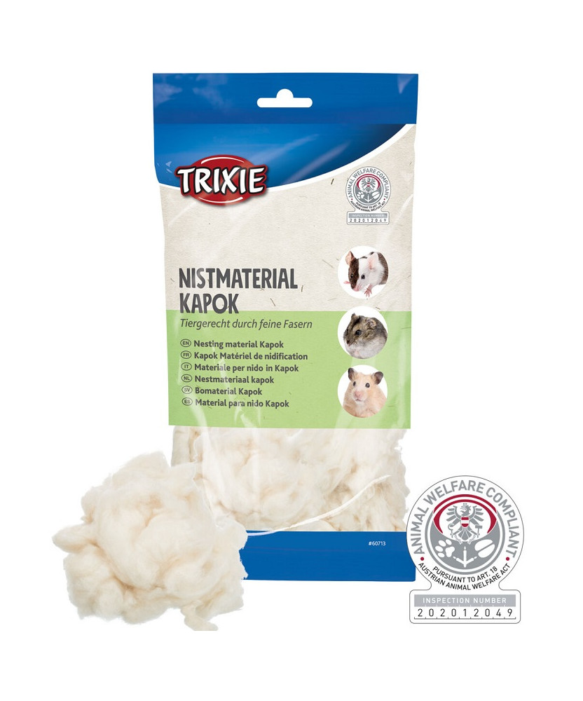Materiale per Nido in kapok animal-friendly grazie alle fibre sottili e facilmente separabili molto soffice e con effetto riscaldante senza polvere in conformità all’art. 18 sul Benessere animale ...