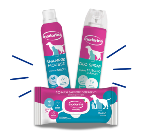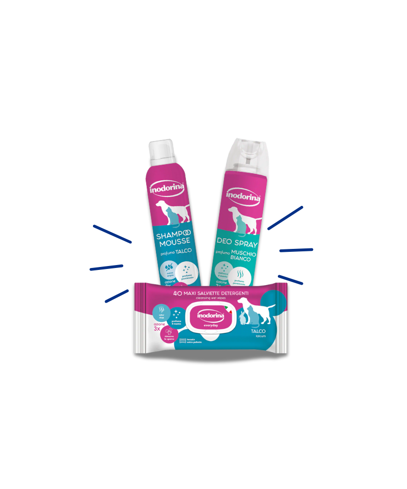 Inodorina Kit Talco - Shampoo Mousse, Deodorante Spray e Salviette per Cani e Gatti