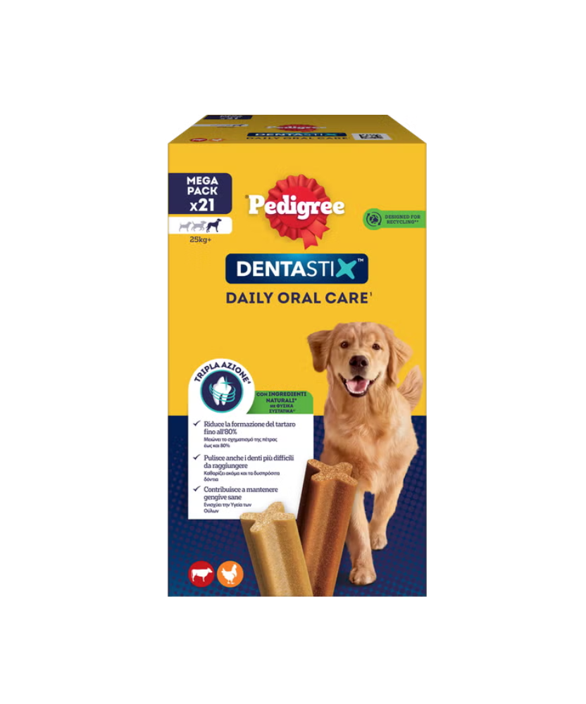 4 cani su 5, oltre i 3 anni, hanno problemi alle gengive causati dalla formazione di placca e tartaro. Pedigree DentaStix Daily Oral Care è lo snack con Tripla Azione che, è scientificamente provato, aiuta a ridurre la formazione del tartaro fino all'80%, pulisce i denti più difficili da raggiungere e contribuisce a mantenere gengive sane.