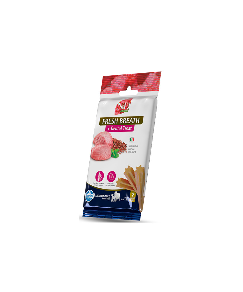 Farmina N&D Quinoa Snack Fresh Breath+Dental Treat per cani Adult M/M con Agnello, Quinoa e Menta da 7 pz